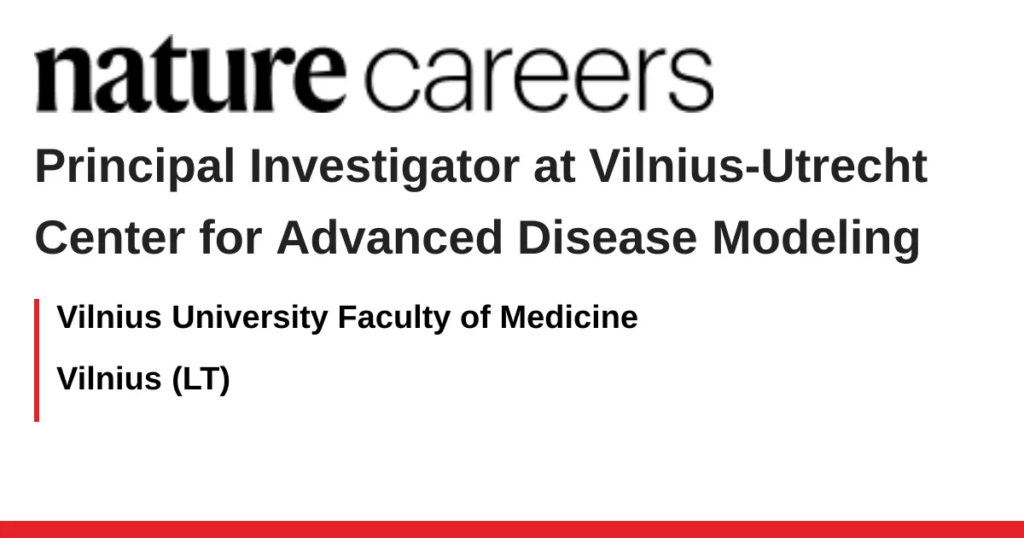 The newly established Vilnius–Utrecht Center for Advanced Disease Modeling at Vilnius University invites applications from highly motivated, creative, and ambitious researchers for Principal Investigator positions. This newly established international Center brings together the complementary strengths of Vilnius University (VU), University Medical Center Utrecht (UMC Utrecht), and Utrecht University (UU) to build a positive research culture fostering environment for translational research in disease biology.